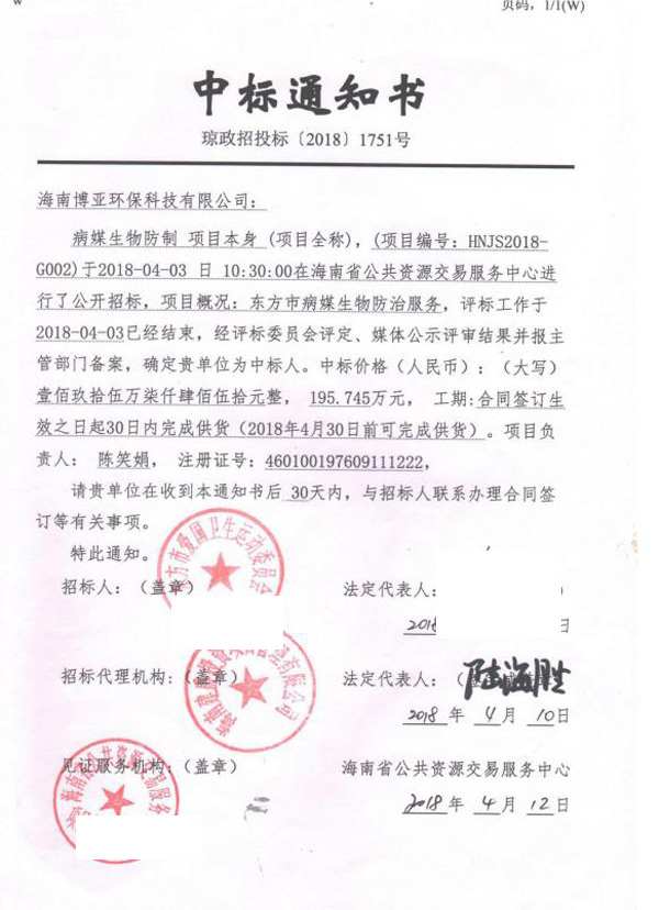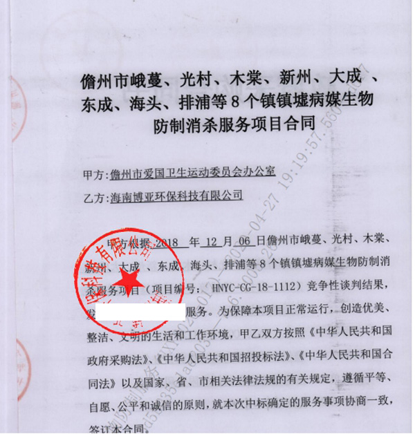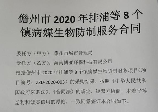 ④、儋州市:2018-2020年間參與了儋州市峨蔓、光村、木棠、新州、大成、東成、海頭、排浦等8個(gè)鎮(zhèn)鎮(zhèn)墟病媒生物防制消殺服務(wù)項(xiàng)目及儋州市建城區(qū)的病媒生物防制服務(wù)。