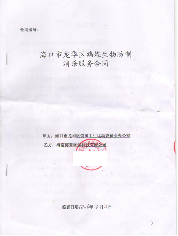 公司成立以來(lái),在省內(nèi)參與了多項(xiàng)重大活動(dòng),如:承包澄邁縣城、樂(lè)東縣城、白沙縣城創(chuàng)建省級(jí)衛(wèi)生縣城、創(chuàng)建國(guó)家衛(wèi)生縣城中的病媒生物防制工作;承包海口市、東方市創(chuàng)建國(guó)家衛(wèi)生城市、創(chuàng)建省級(jí)衛(wèi)生城市中的病媒生物防制工作等。運(yùn)用多年來(lái)公司在創(chuàng)衛(wèi)過(guò)程中摸索及總結(jié)出來(lái)的方法及操作模式,致力于創(chuàng)衛(wèi)工作。