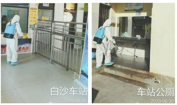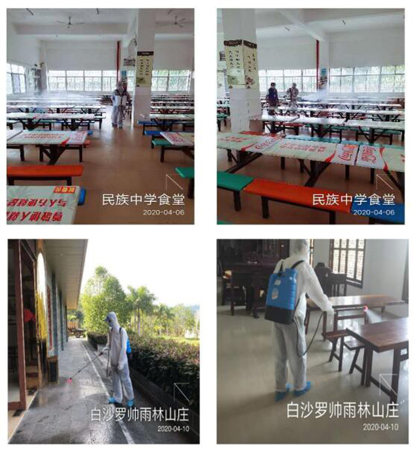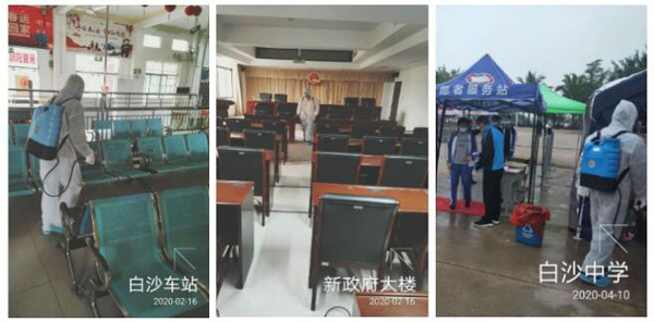 如白沙黎族自治縣,在疫情爆發(fā)前期我公司于2020年1月26日始派駐專業(yè)消毒隊(duì)伍,按照白沙縣疫情防控消毒方案,利用機(jī)動(dòng)背負(fù)式噴霧器、電動(dòng)背負(fù)式超低量噴霧器、脈沖機(jī)、肩掛式等各類機(jī)器(至少30臺(tái))對(duì)白沙縣建成區(qū)的機(jī)關(guān)企事業(yè)單位、學(xué)校、超市、車(chē)站、醫(yī)院、農(nóng)貿(mào)市場(chǎng)、餐飲店、酒店、賓館、五小店面、公園、城中村等區(qū)域,以及白沙縣境內(nèi)的工廠、景區(qū)、工地等場(chǎng)所室內(nèi)外環(huán)境(主要以室內(nèi)環(huán)境為主)進(jìn)行消毒。